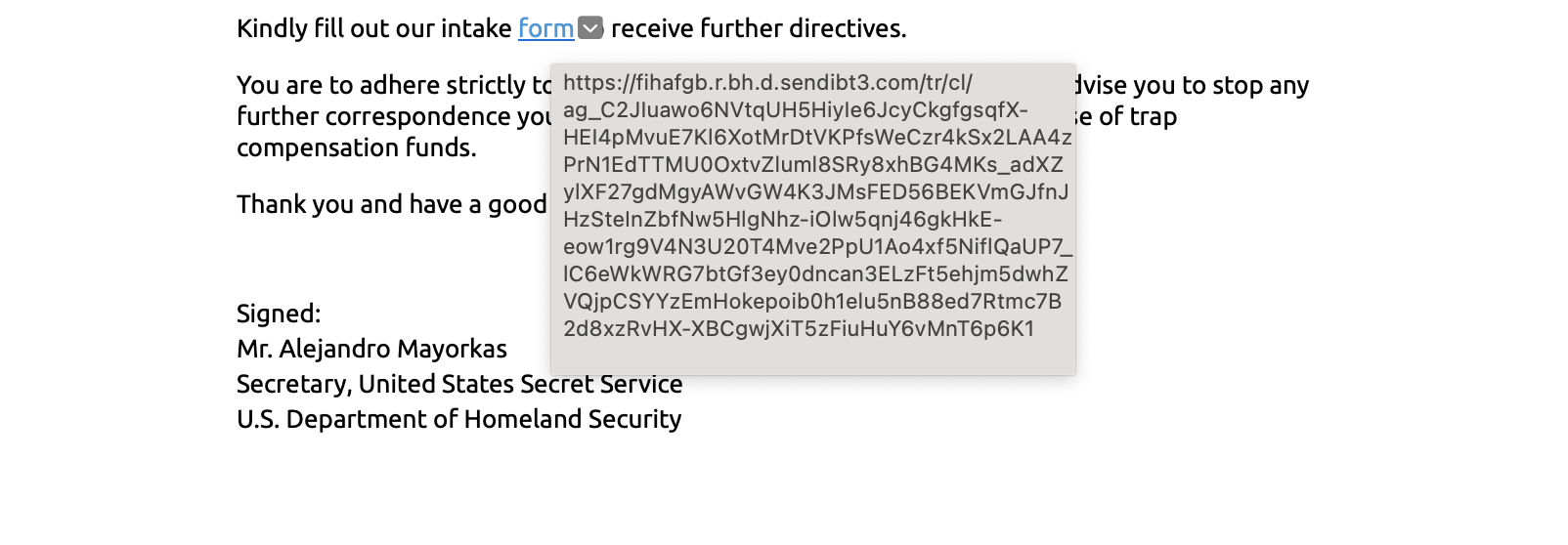 Notice that the domain for the link ("sendibt3.com") does not match the appropriate government domain ("dhs.gov")? Even though a legitimate link may have a lot of garbled characters, most will still list the sender's domain name.