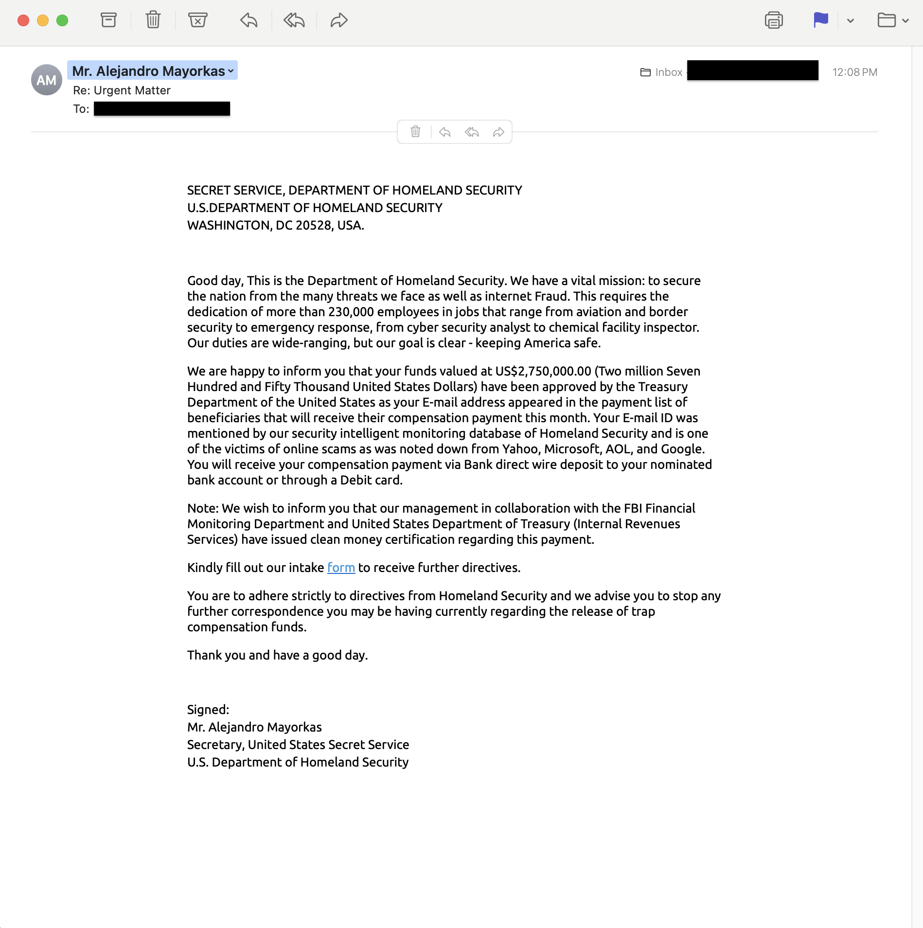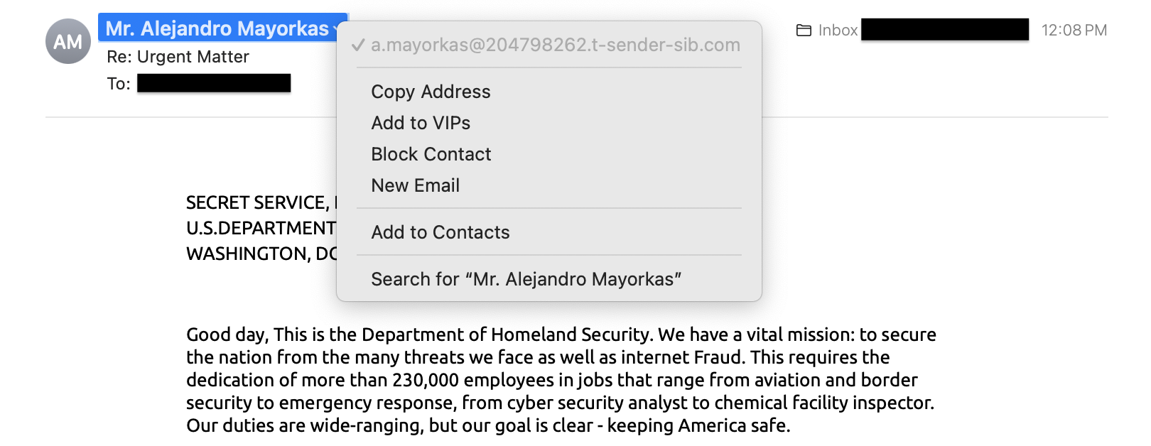 An email from Homeland Security? That sounds important. I shouldn't ignore that. It's directly from Alejandro Mayorkas? I've heard that name in the news. He's someone official. This can't be fake. I should definitely not ignore this, right?