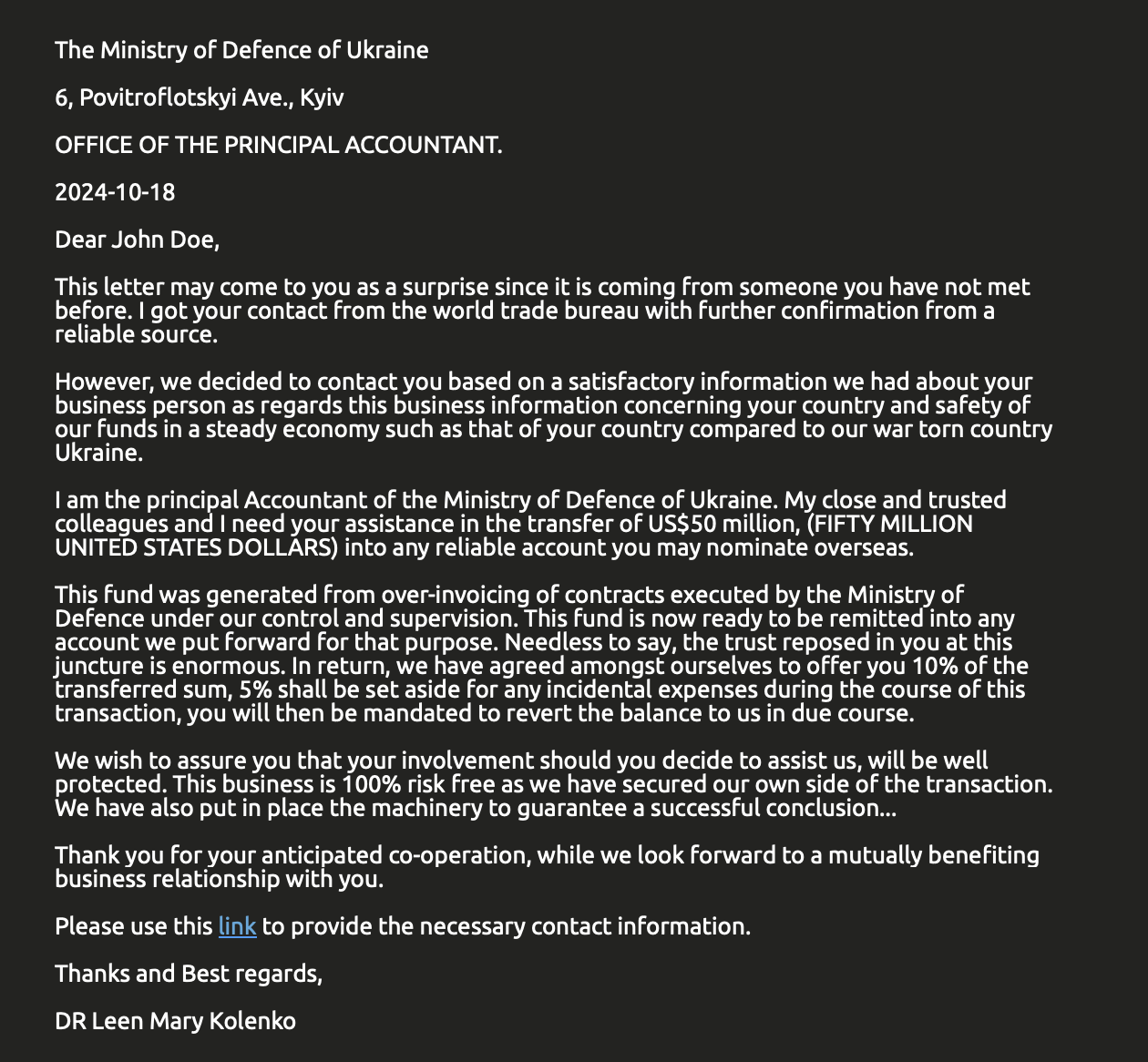 The important thing to remember is that the email doesn't need to have anything to do with a Nigerian Prince. That's just one variant of the scam that became extremely popular. In fact the scam probably originates somewhere else. The scammers choose Nigeria because the country's reputation for corruption made the email somewhat plausible. Newer variants may latch onto any country or part of the world known for turmoil or corruption. For example, this email relies on the recipient's knowledge of the war in Ukraine to make the offer seem possible.